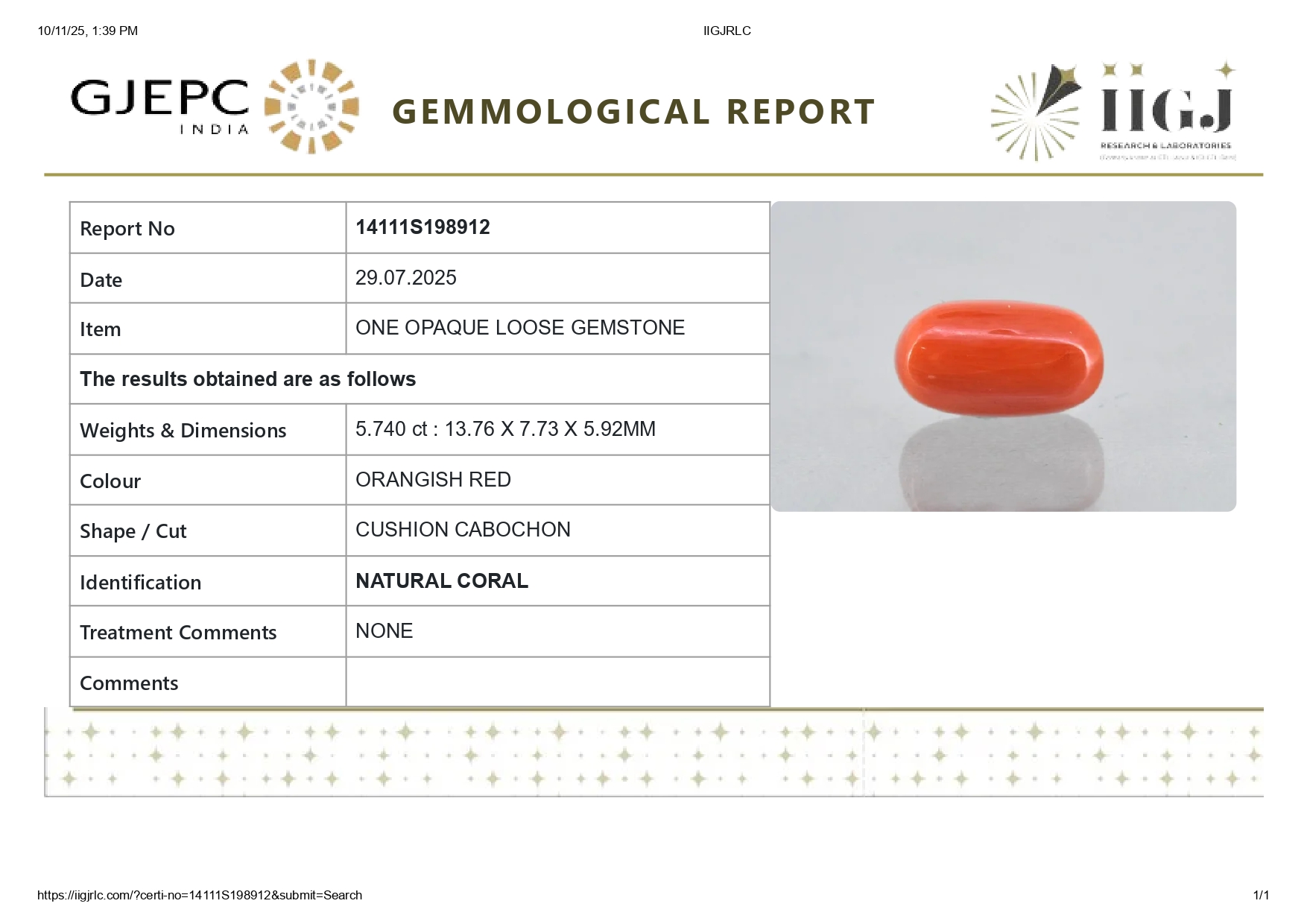 Buy 5.74 carats (6.31 Ratti) 100% natural Italian red coral (Moonga) stone online, directly imported from Italy (also called "Italian Red Coral"). Moonga Stone is a source of enormous power & strength. Check out the exclusive inventory online available all shapes (Triangular, Capsule & Oval) with a reputed IIGJ certificate.