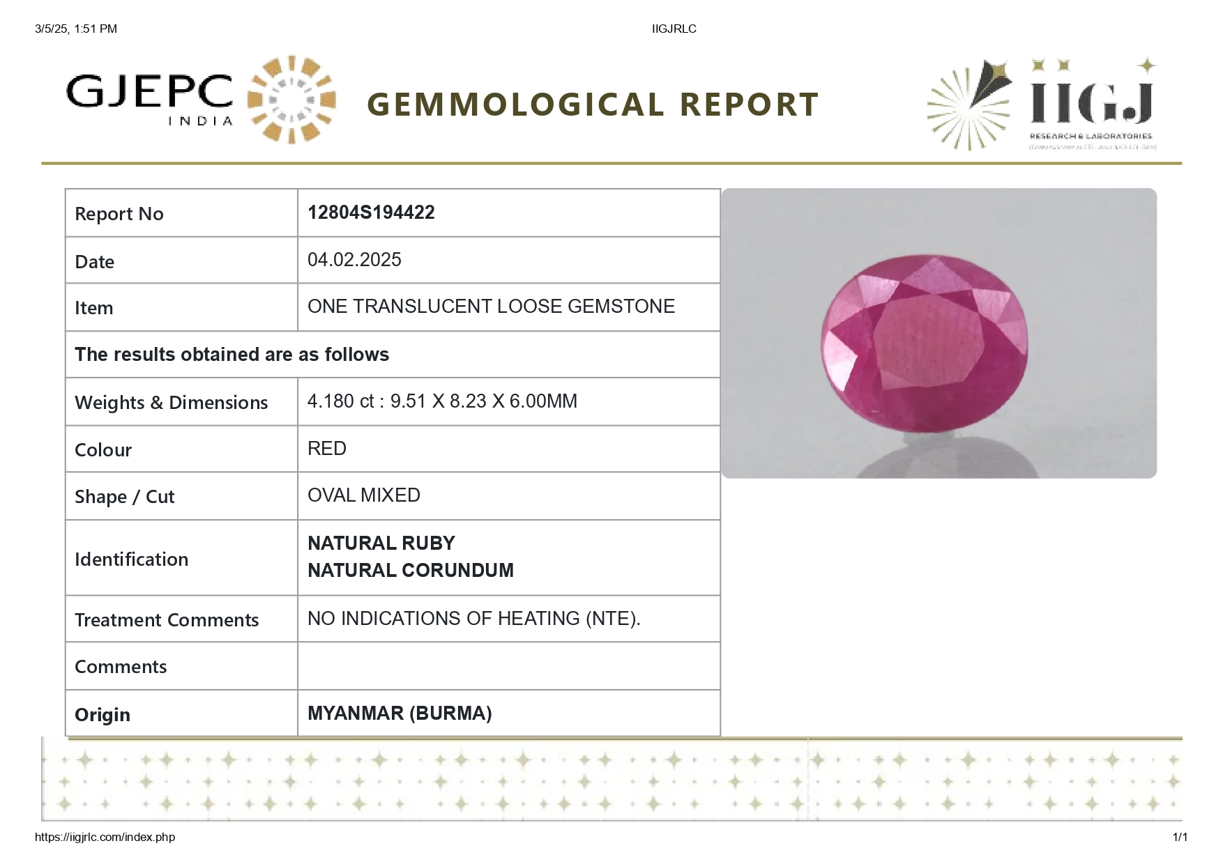 Buy one beautiful translucent 4.18 ct/ 4.59 Ratti Original Ruby. It has a oval shape, and a clarity grade of eye clean (evaluated at eye level), Red Color intensity, and an excellent polish. The origin of this ruby is Burma. This stone is unheated & untreated and certified from IIGJ Lab.